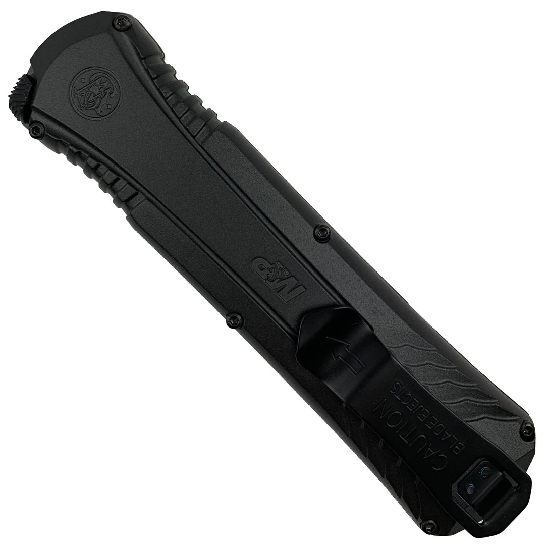 This exclusive out-the-front knife features a black handle, all-black hardware and a tanto style blade in a black finish.