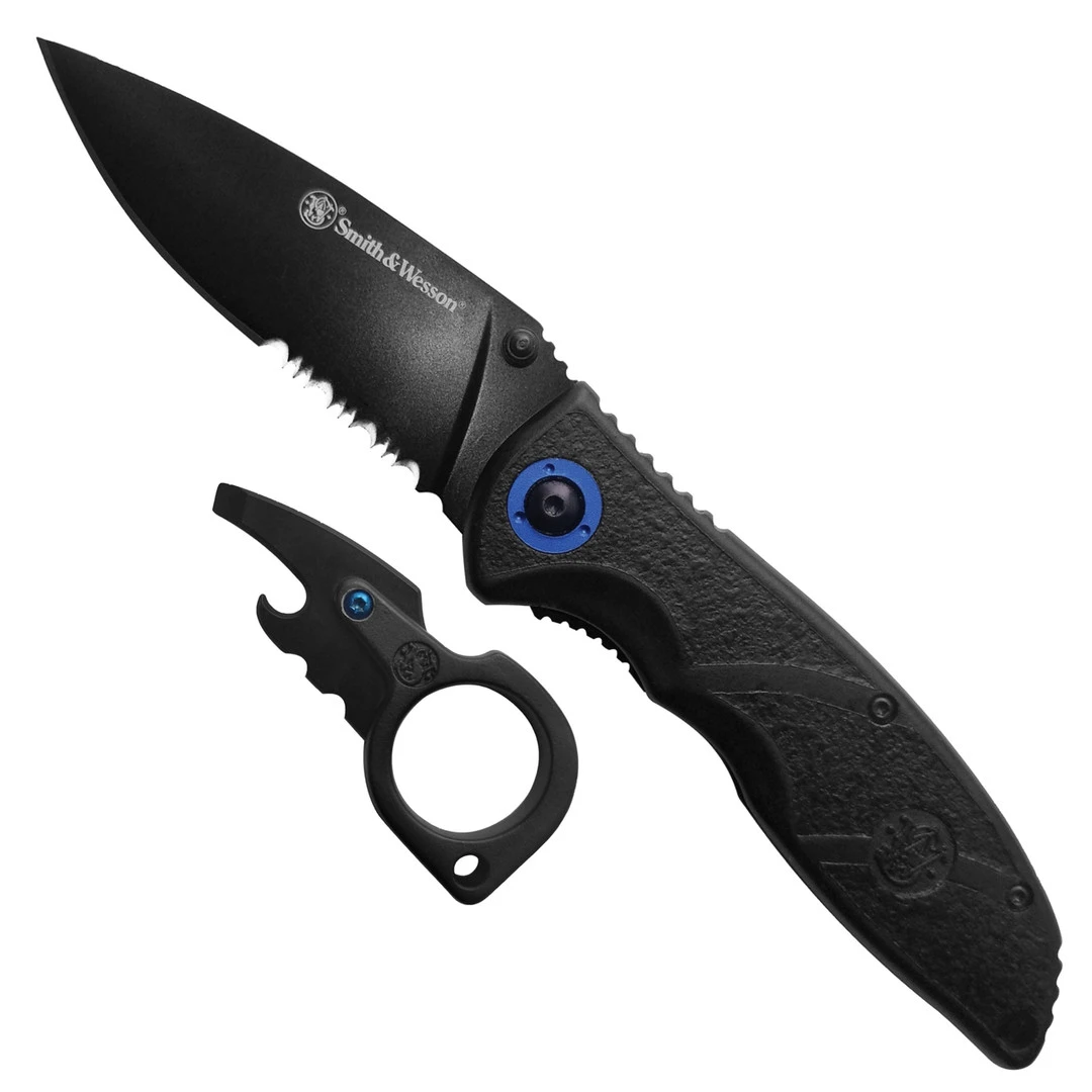 The legacy of Smith & Wesson knives and tools is built on fine craftsmanship, quality and dependability. Their expansive line consists of assisted opening, folding and fixed blade knives, as well various multi-tools and accessories in an effort to offer something for every need and every job. Each model features a liner lock design and the stainless steel blade is deployed with the ambidextrous thumb studs while the integrated paper washers allows for quick fluid action even without the use of any springs. This model features black plastic handle scales, stainless steel liners, a partially serrated drop point style blade in a black oxide finish and the deep carry pocket clip is statically designed for tip down carry only on the traditional side of the handle. Additionally, the free keychain tool has a bottle opener feature and screwdriver tip.