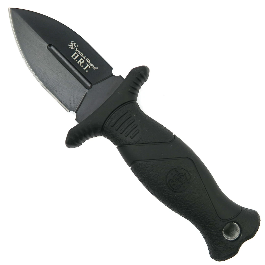 The Smith & Wesson HRT full tang boot knife is a tough, tactical tool. This knife boasts a blade made of high carbon stainless steel in a classic black finish. The blade is a spear point blade with blood grooves. The handle is TPE rubber wrapped in order to provide a solid, comfortable grip.Â