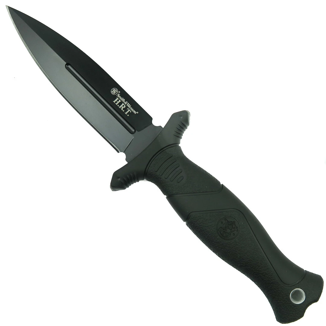 The Smith & Wesson HRT full tang boot knife is a tough, tactical tool. This knife boasts a blade made of high carbon stainless steel in a classic black finish. The blade is a dual-edged spear point blade with blood grooves. The handle is TPE rubber wrapped in order to provide a solid, comfortable grip even in wet conditions. The handle includes a lanyard hole for additional carry options.