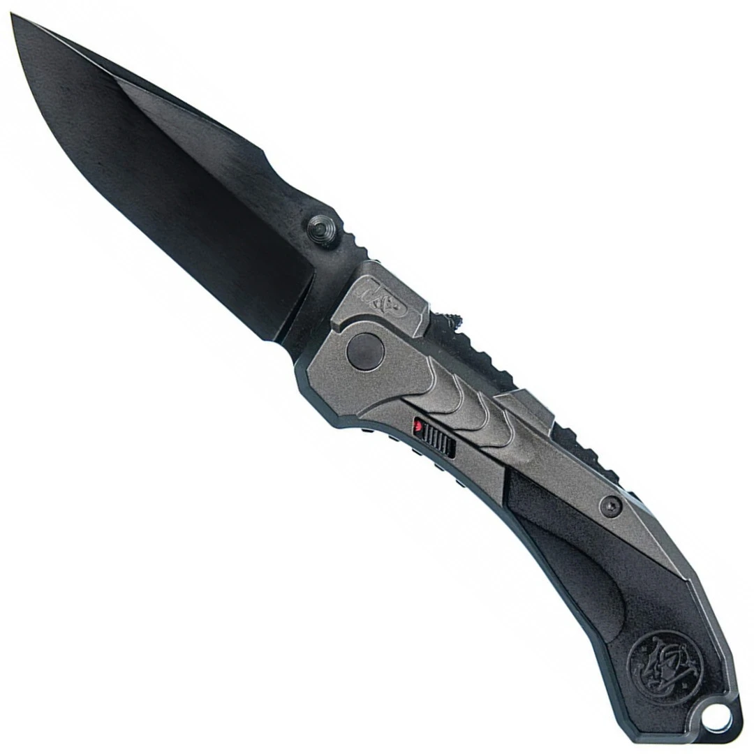 The legacy of Smith & Wesson knives and tools is built on fine craftsmanship, quality and dependability. Their expansive line consists of assisted opening, folding and fixed blade knives, as well various multi-tools and accessories in an effort to offer something for every need and every job. Each spring assisted model boasts quick speed while the unique mechanism automatically engages the safety as soon as you close the blade. This model features dark grey aluminum handles complete with black rubber overmold, stainless steel liners, a modified drop point style blade in a black finish and the pocket clip is statically designed for tip down carry only on the traditional side of the handle.