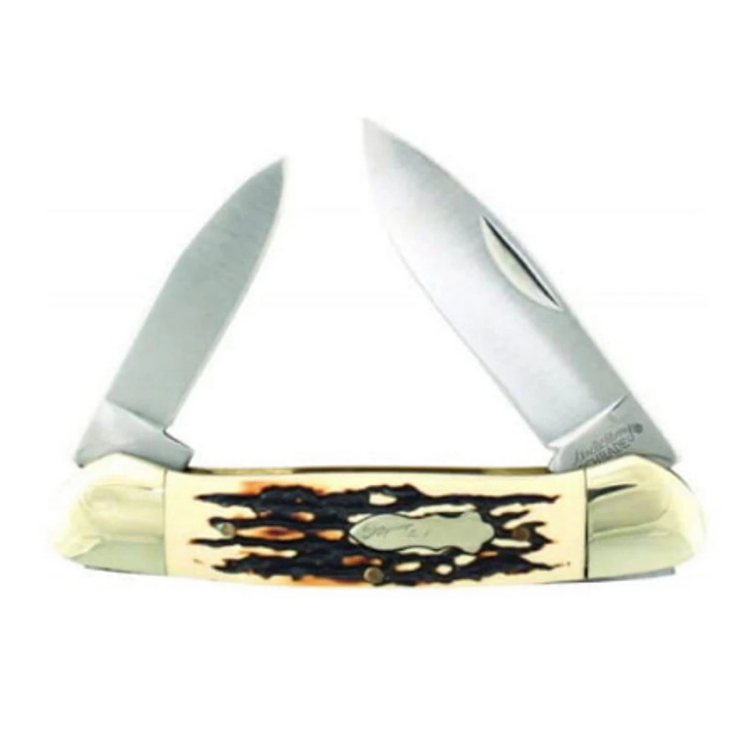 The Schrade Uncle Henry Large Canoe Next Gen Folding Knife is made for your EDC needs. It comes with two blades, both drop point, including nail nicks to open and a satin finish. The Bone colored handle gives this knife the beautiful look of traditional pocket knives. This two in one knife allows you options to pick the right size blade for your cutting needs.