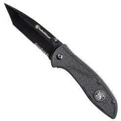 The legacy of Smith & Wesson knives and tools is built on fine craftsmanship, quality and dependability. Their expansive line consists of assisted opening, folding and fixed blade knives, as well various multi-tools and accessories in an effort to offer something for every need and every job. Although classified as a folder, the action is almost “flipper-like” meaning you can open the blade with a slight push with the thumb via the thumb stud. This model features black texttured rubberized aluminum handle scales, stainless steel liners, a partially serrated tanto style blade in a black finish and the deep carry pocket clip is statically designed for tip down carry only on the traditional side of the handle.