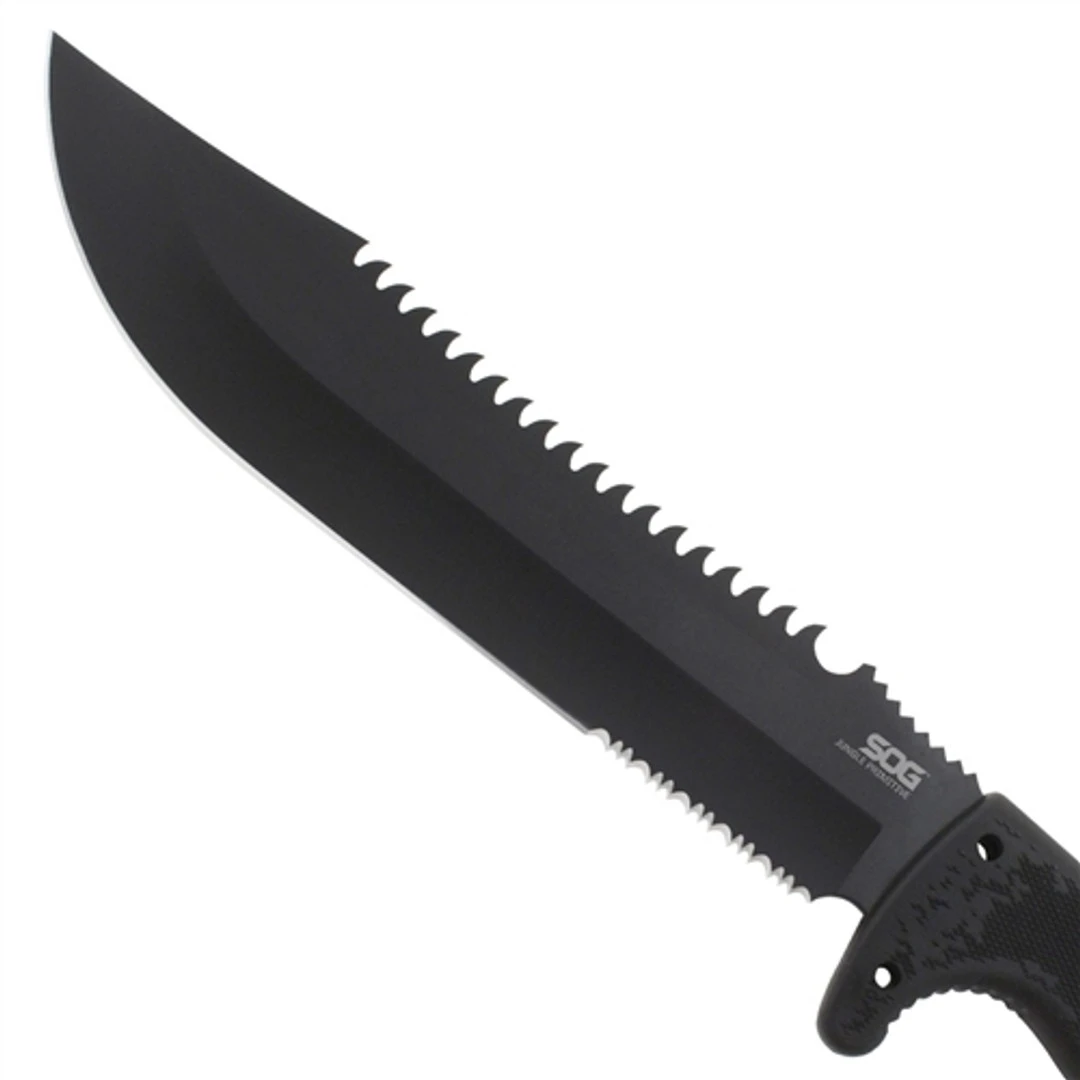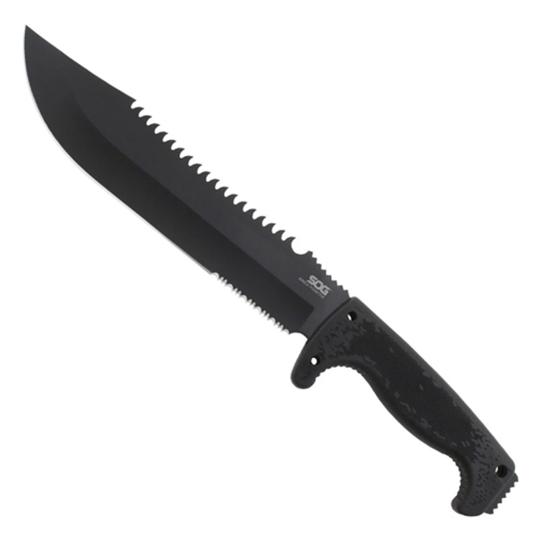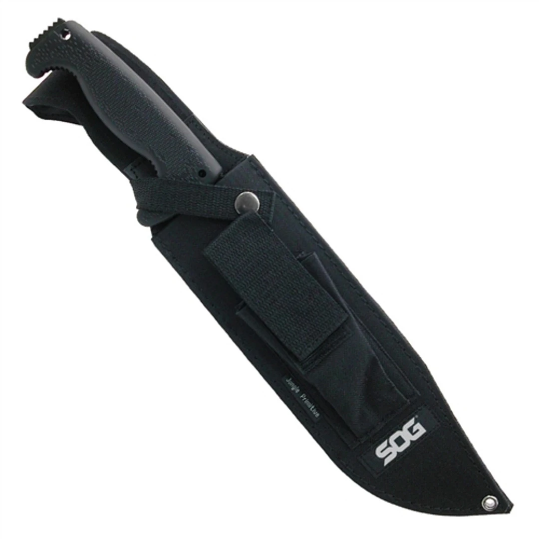 The SOG Jungle Primitive fixed blade knife is for the primitive in you. This knife is built with a durable and comfortable molded Kraton handle that features the SOG trademark Digi-Grip for maximum gripping power for when you need it. The Jungle Primitive knife is hard to categorize because it can be utilized as a small machete, limb saw or even a hammer and also includes a ballistic nylon sheath with utility pouch.