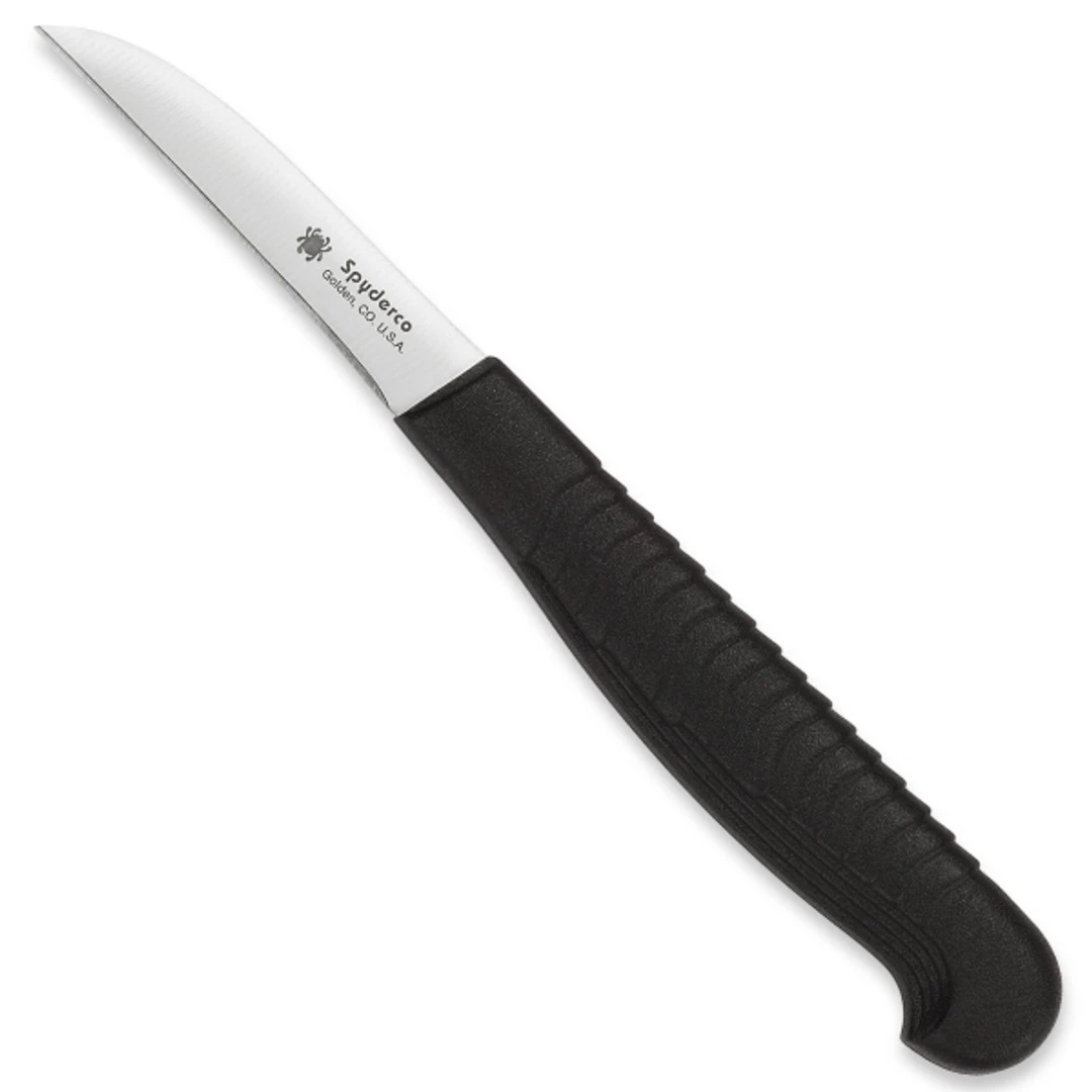The Spyderco Black Mini Paring Knife boasts all the distinctive features that Spyderco is known for along with several improvements. The K09PBK boasts a 2 1/4 inch, Plain Edge drop point blade making it an ideal go to knife for homes and commercial kitchens. Versatile and adaptable, this knife is perfect for a wide range of kitchen cutting chores and utility applications. The premium MBS-26 stainless steel is ground incredibly thin and treated for optimal cutting performance. The black handle is durable polypropylene molded directly onto the tang. It has a distinctive stepped texture pattern that gives incredible control and comfort while using.