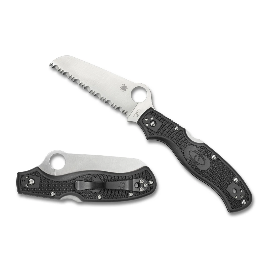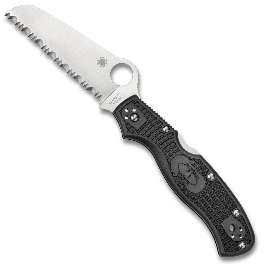 The Rescue 3 takes the time-tested Rescue design and upgrades it with enhances features including an ergonomically enhanced handle for superior power. As the name implies, this knife is a favorite amongst rescue personnel and first responders because of the blade style which prevents accidental puncturing. Each model comes standard with Spyderco’s patented Bi-Directional Texturing™ which provides plenty of gripping power and a high-strength back lock mechanism–a locking system positioned on the back of the handle that uses a rocker arm that pivots in the center. This model features a black FRN (Fiberglass Reinforced Nylon) handle, stainless steel liners, a fully serrated (SpyderEdge) sheepsfoot style blade in a satin finish, Spyderco’s trademark round hole opening feature and an ambidextrous 4-way positional pocket clip which allows for a tip up or tip down carry option on either side of the handle.