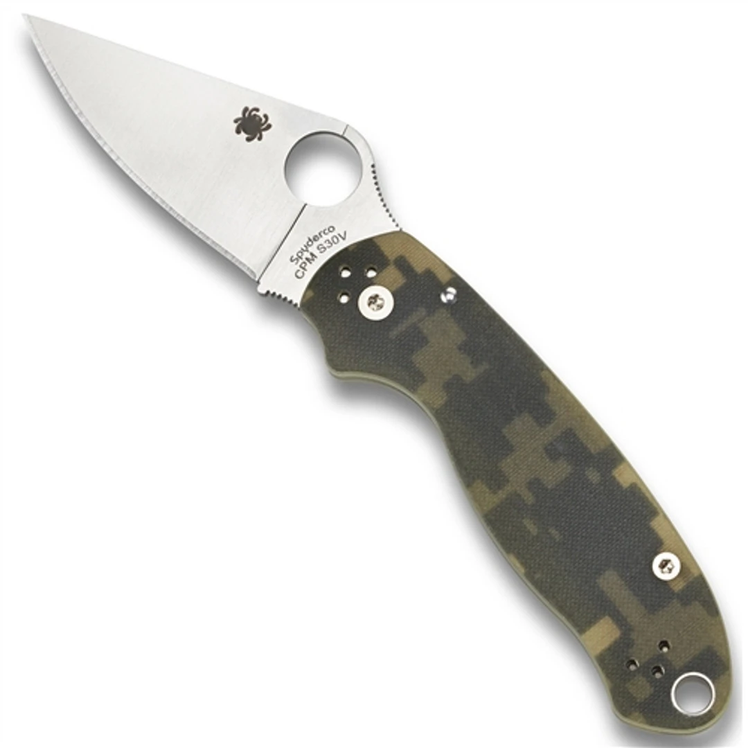 The Para 3 folder model was designed through the original concept of the ever-so-popular Spyderco Paramilitary series but never quite made it into production. At last, after much anticipation and suggestions from the beloved family of Spyderco lovers worldwide, the Para 3 is ready to launch into the hands of the consumer. The Paramilitary 2 has been regarded as one of the most popular folder knives ever created and so the Spyderco Para 3 offers the same exceptional performance and reliability but in a more compact and pocket-friendly design. Each model features a premium stainless steel blade that is supported by Spyderco’s patented Compression Lock™ mechanism–allowing users to safely close the blade with one hand without ever having the operating hand come near the cutting edge. Much like the design of Paramilitary 2, it still features a slightly flared handle base as well as the integrated jimping which provides increased control with any cutting job. This model, the C223GPCMO, features a digi camo G-10 handle, a satin finished clip point blade, Spyderco’s trademark round hole opening feature and an ambidextrous 4-way positional pocket clip which allows for a tip up or tip down carry option on either side of the handle. Made in the USA.