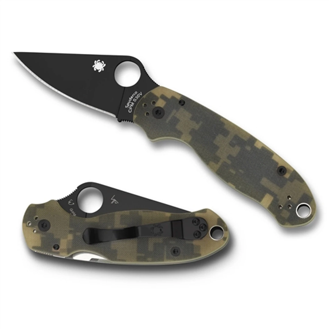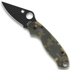 The Para 3 folder model was designed through the original concept of the ever-so-popular Spyderco Paramilitary series but never quite made it into production. At last, after much anticipation and suggestions from the beloved family of Spyderco lovers worldwide, the Para 3 is ready to launch into the hands of the consumer. The Paramilitary 2 has been regarded as one of the most popular folder knives ever created and so the Spyderco Para 3 offers the same exceptional performance and reliability but in a more compact and pocket-friendly design. Each model features a premium stainless steel blade that is supported by Spyderco’s patented Compression Lock™ mechanism–allowing users to safely close the blade with one hand without ever having the operating hand come near the cutting edge. Much like the design of Paramilitary 2, it still features a slightly flared handle base as well as the integrated jimping which provides increased control with any cutting job. This model, the C223GPCMOBK, features a digi camo G-10 handle, a DLC (Diamond Like Carbon) black finished clip point blade, Spyderco’s trademark round hole opening feature and an ambidextrous 4-way positional pocket clip which allows for a tip up or tip down carry option on either side of the handle. Made in the USA.