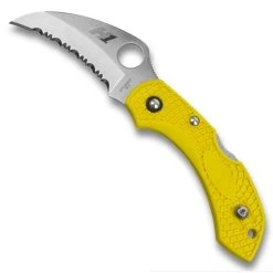 The Dragonfly 2, while not a new knife by any means, quickly gained notoriety with its incredibly lightweight yet versatile design. Now in its 2nd generation, each model not only features a front finger choil in addition to a lock back design, but the positive thumb ramp aids blade control especially when performing finer tasks. Additionally, the patented Bi Directional Texturing featured on many of their models allows the knife to remain feather-light while performing like a heavyweight and the nitrogen-based blade alloy comes in at 100% rustproof. This model, the C28SYL2HB, features a yellow FRN (Fibergrass Reinforced Nylon) handle, a fully serrated (SpyderEdge) hawkbill style blade in a satin finish, Spyderco’s trademark round hole opening feature and the reversible pocket clip allows for a tip up only but is eligible for a left or right hand carry option.