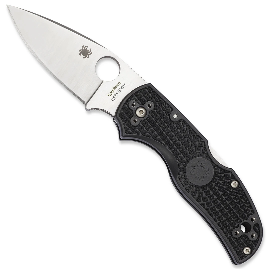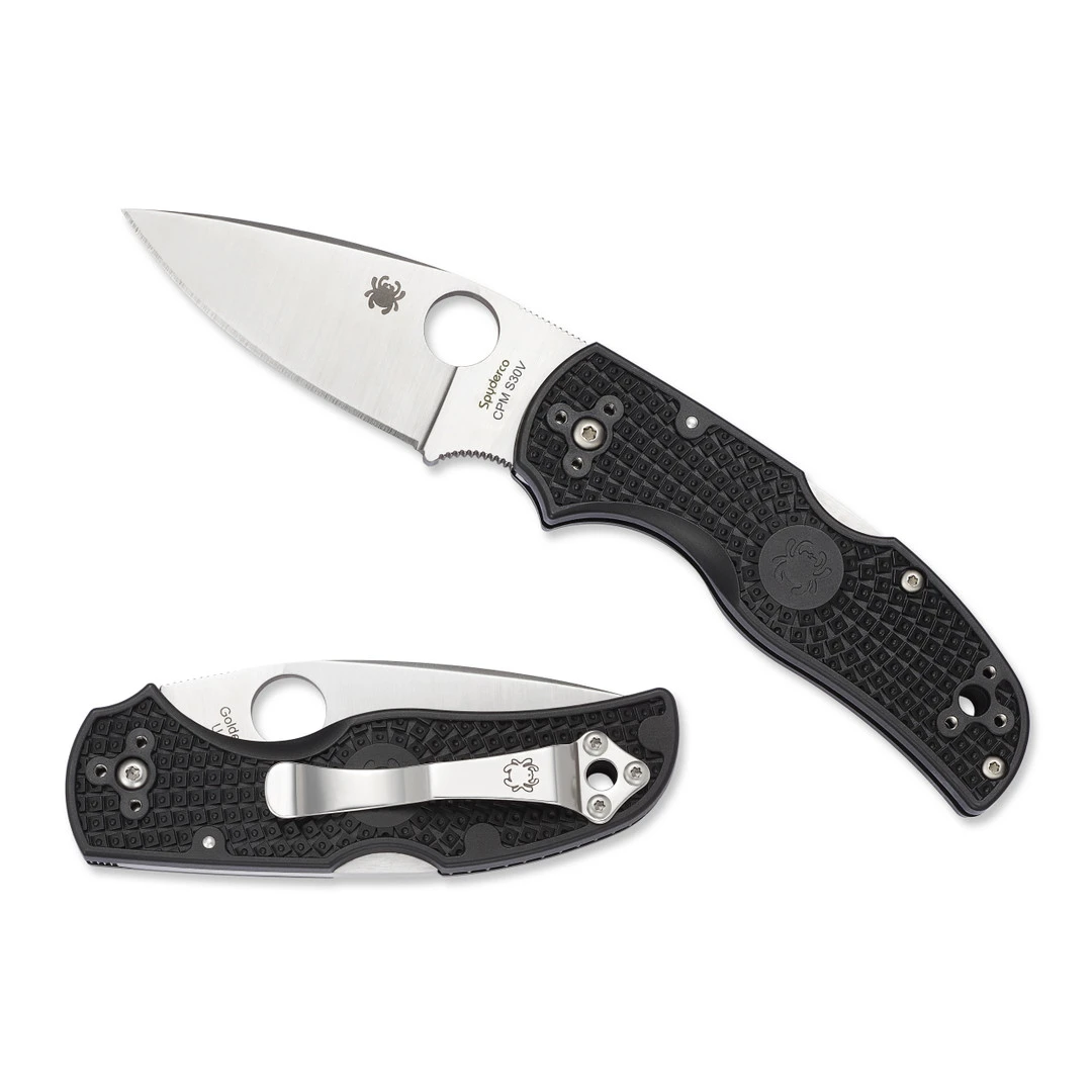 The Native 5 redefines what a practical and multi-functional cutting tool should be–combining the original size, shape and ergonomics of the classic Native model while incorporating significant design and engineering upgrades. The Native 5 models also feature a highly refined back lock mechanism that uses a rocker arm that pivots in the center which represents the pinnacle of strength and ease of operation. The added finger choil with jimping both there are on the spine of the blade provide an opportunity for precision cutting and the enlarged torx screws allow for user-friendly maintenance with easy adjustments. Like most of Spyderco’s popular models, the Native 5 comes in many different models with varying handle materials, handle colors, blade finishes, blade variations and finally blade materials. This lightweight model features a black FRN (Fiberglass Reinforced Nylon) handle, a satin finished leaf shaped blade, Spyderco’s trademark round hole opening feature and an ambidextrous 4-way positional pocket clip which allows for a tip up or tip down carry option on either side of the handle. Made in the USA.