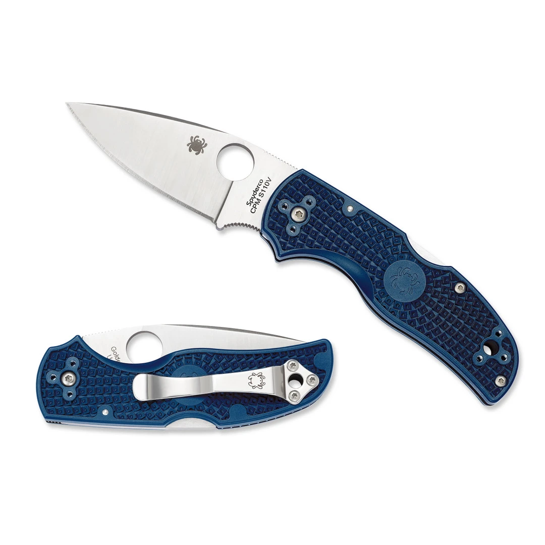 This steel is similar to CPM-S30V but the additional Niobium carbides improves resistance to wear and chipping while still providing increased edge retention properties. The Native 5 models also feature a highly refined back lock mechanism that uses a rocker arm that pivots in the center which represents the pinnacle of strength and ease of operation. The added finger choil with jimping both there are on the spine of the blade provide an opportunity for precision cutting and the enlarged torx screws allow for user-friendly maintenance with easy adjustments. Like most of Spyderco’s popular models, the Native 5 comes in many different models with varying handle materials, handle colors, blade finishes, blade variations and finally blade materials. This model, the C41PDBL5, features a lightweight textured dark blue FRN (Fiberglass Reinforced Nylon) handle, a satin finished leaf shaped blade in ultra premium CPM-S110V stainless steel, Spyderco’s trademark round hole opening feature and an ambidextrous 4-way positional pocket clip which allows for a tip up or tip down carry option on either side of the handle. Made in the USA.