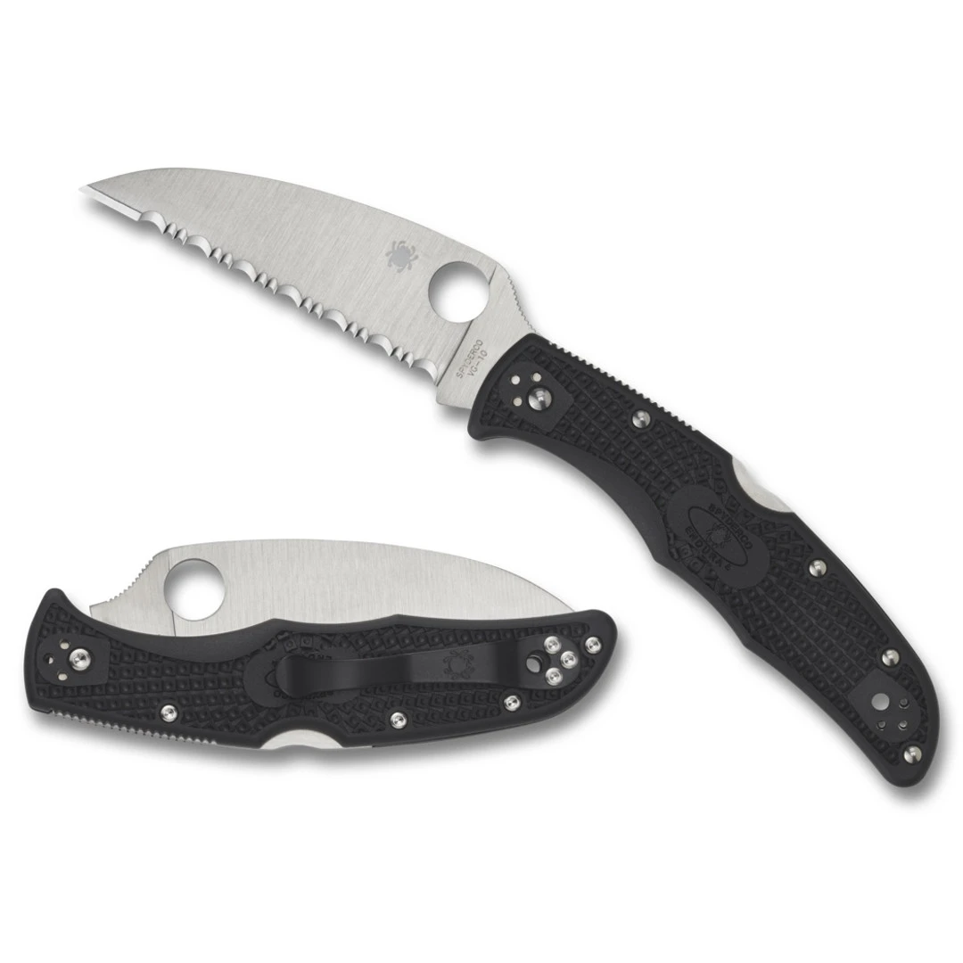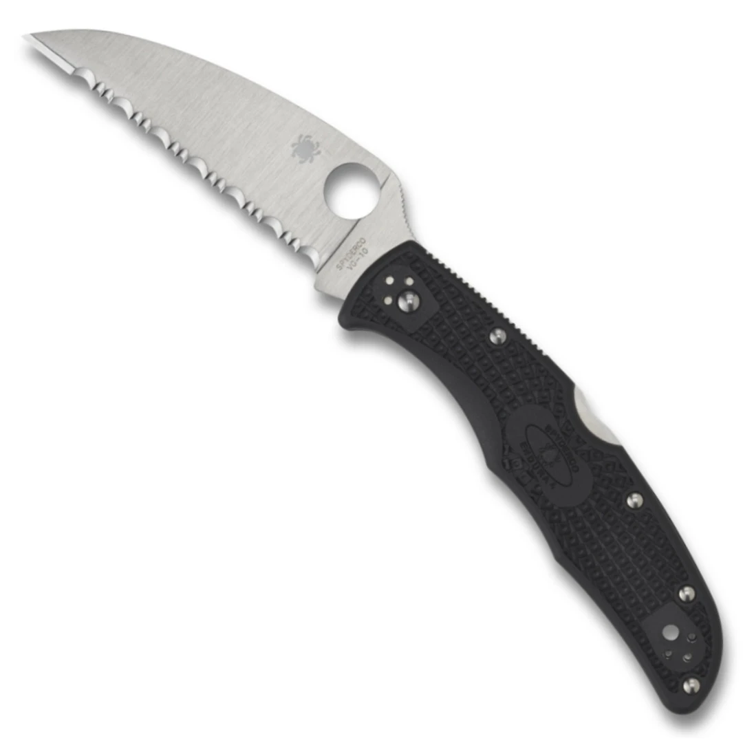 The Spyderco Endura series first debuted over 25 years and blazed the trail as one of the first lightweight clip-carry folder knives. Now in its 4th generation, the Spyderco Endura 4 folder knife has continually improved upon itself–offering a broad range of variations and finishes to meet virtually every users taste, style and needs. Each model features a stainless steel blade that is supported by Spyderco’s back lock mechanism–securely locking the blade when in use yet allowing for easy ambidextrous release and Spyderco’s high-traction Bi-Directional Texture™ pattern excels in formidable grip security. This model features black FRN (Fiberglass Reinforced Nylon) handle scales, a fully serrated (SpyderEdge®) wharncliffe style blade in a satin finish and the 4-way positional pocket clip allows for a tip up or tip down carry option on either side of the handle.
