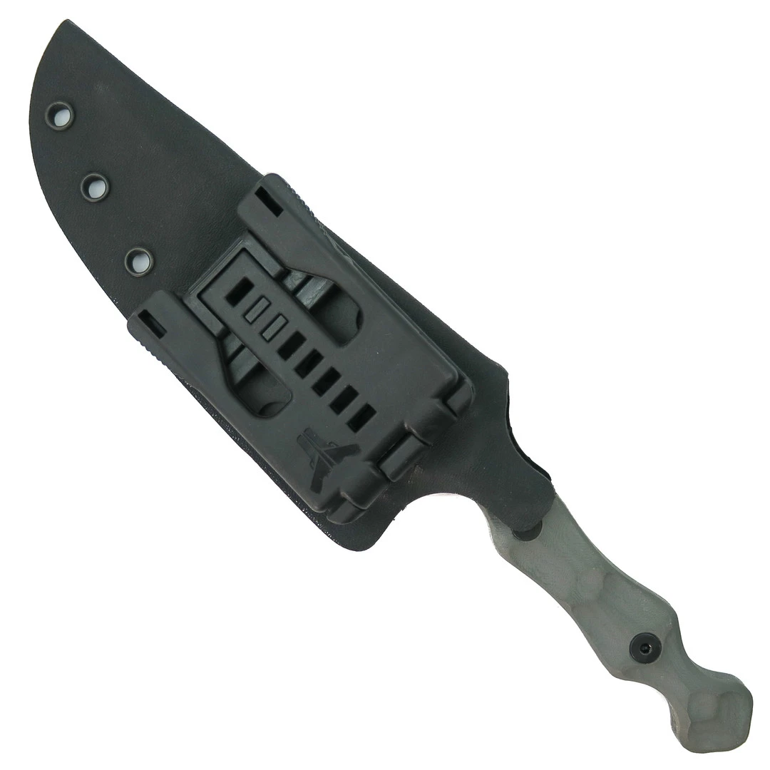 Comes with a Kydex sheath and can be carried on LBE gear or on your belt–either vertically or scout style. The milled Gray G10 handle lends itself to both a classic hammer grip and a reverse grip. The indentations allow for easy indexing.