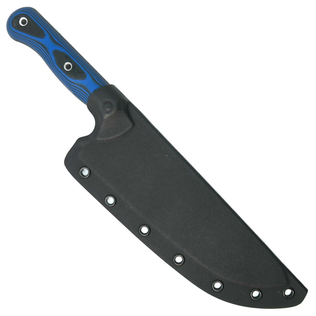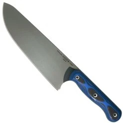 The TOPS Knives Dicer 8 Chef Knife, designed by Jesus Arellano, makes preparing your meal a breeze. This knife boasts a blade with roughly 7.75″ of cutting edge and has a little more belly than your standard chef’s knife. The blade is made of high quality CPM-S35VN steel. This steel holds its edge better than most kitchen knives and is able to take a very keen edge. The blue and black layered G10 handle gives your steak knife a fantastic look. The handle features comfortable contouring so you can spend longer working on your meal without any hand cramping. No kitchen is complete without this knife.Â