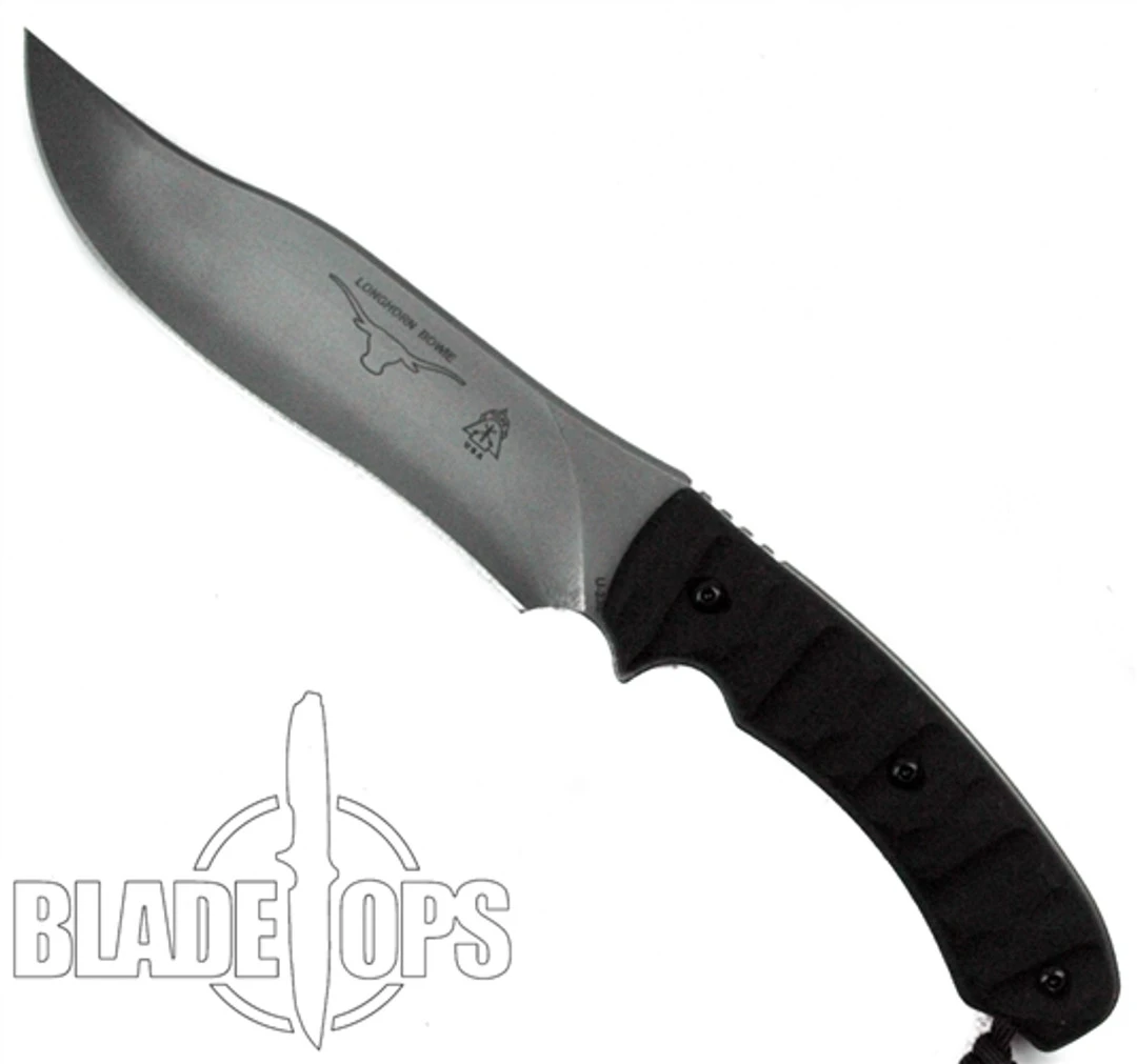 The TOPS Knives Longhorn Bowie is a new update to an old favorite. This special RMT edition features Rocky Mountain Tread handle scales and is built with a classic Bowie style blade featuring a Black River Wash finish. The finger choil allows you to choke up and get small work when necessary, but the Black Linen Micarta handle scales really perform during heavy cuts and long periods of use. Comfortable, big and bold, you don’t have to be from Texas to own one of these Longhorn Bowie knives. A favorite for all field types. TOPS Knives–designed for the men that don’t fit in. Made in the USA.