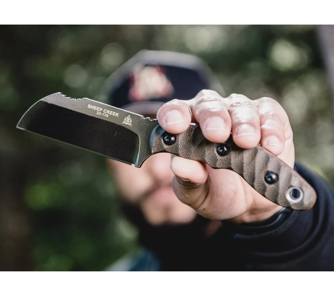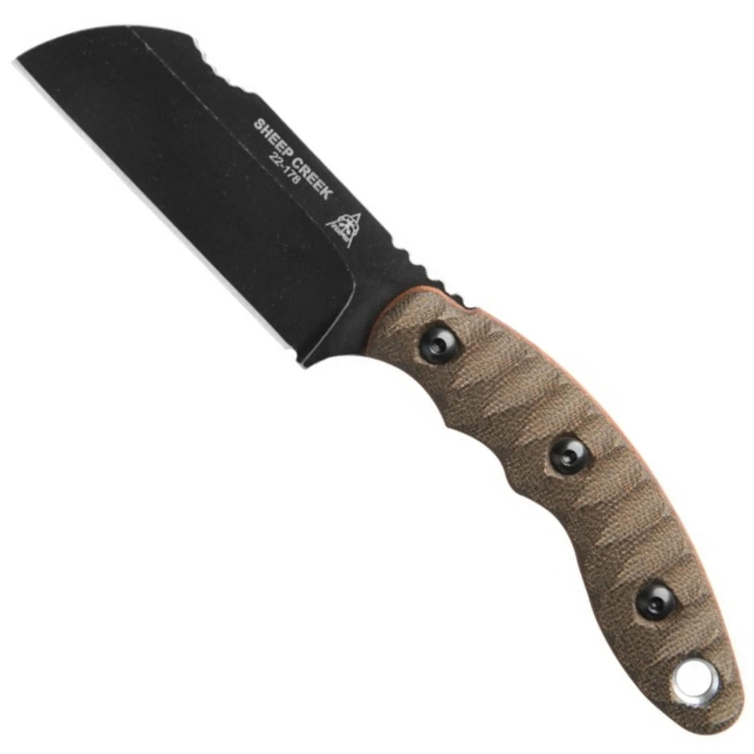 The TOPS Knives Sheep Creek Knife boasts a Sheep’s Foot or Wharncliffe blade of 154CM stainless steel with a Rough Terrain finish. Perfect for EDC and big enough for your next camp, this knife boasts an incredibly comfortable and secure grip with it’s tan canvas/green canvas micarta handle scales.