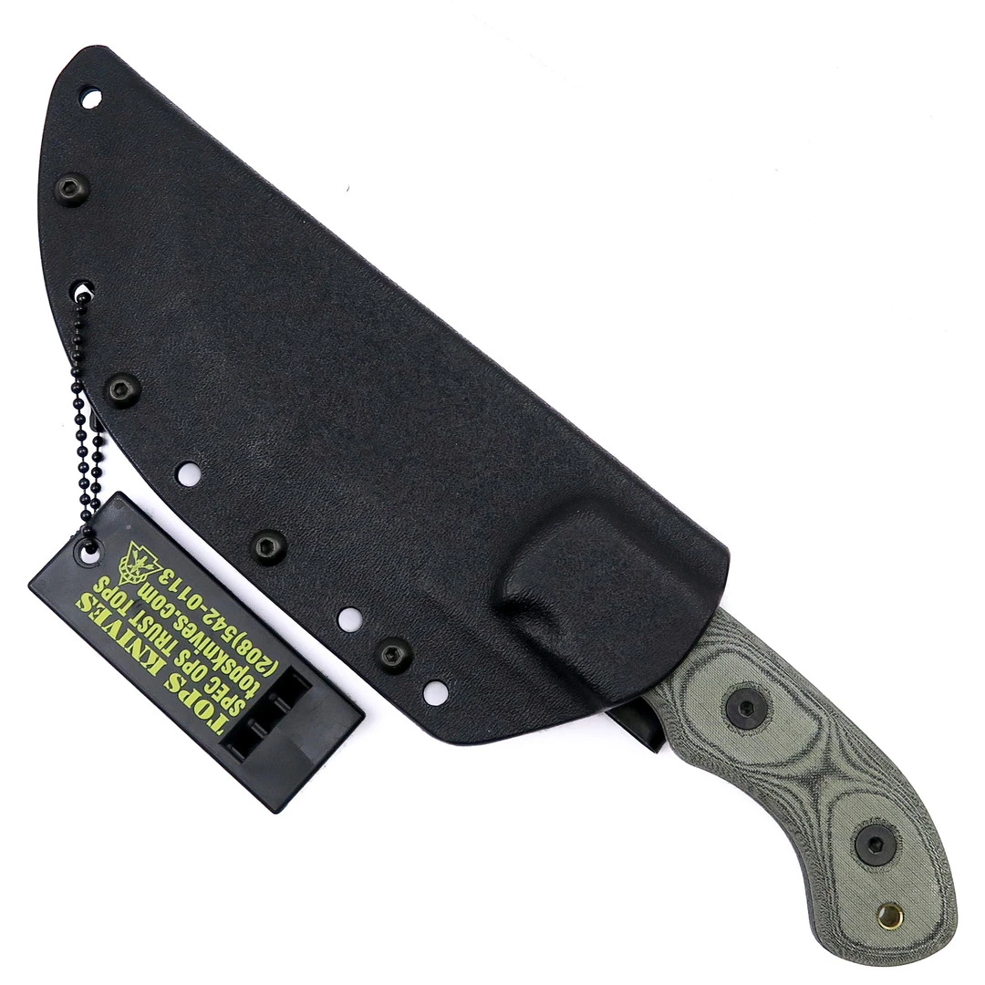 The TOPS Knives Tom Brown Tracker #2 Fixed Blade Knife is an amazing knife. Built as a smaller version of the larger Tom Brown Tracker knife, this fixed blade knief features a curved drop point blade with modifications that will serve you well in survival situations, combat situations, or just about anywhere you take the knife. It features an offset “saw” that will give you extra heavy duty cutting and sawing capabilities. Each of these beauties is built with linen micarta handles. It also comes with a Kydex sheath that has a rotating steel clip. SPECIFICATIONS: Blade Length: 3 1/2″ O/A Length: 9 1/2″ Draw Knife: 2″ Blade Height: 2″ Blade Thickness: 3/16″ Blade Steel: 1095 High Carbon Alloy RC-58 Blade Color: Black Traction Coating Handle Material: Black Linen Micarta® Sheath: Kydex With Two Rotating Steel Spring Clips Weight: .60lb Mfg. Handcrafted in the USA