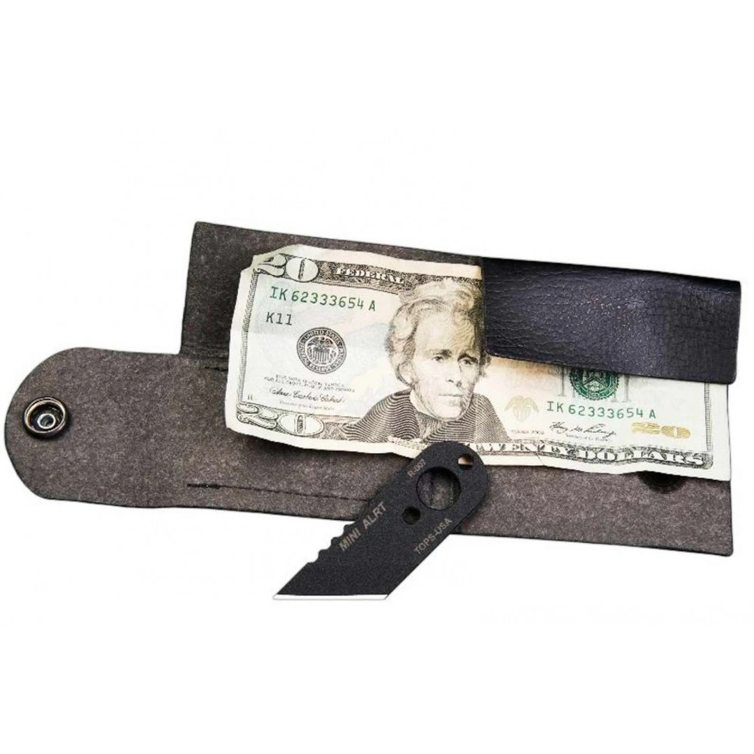 The ALRT Mini is ideal for the savvy traveler due to the concept of keeping both your money and knife out of sight. This small fixed blade is mounted behind the wallet and utilizes a small lanyard to rapidly deploy should the need arise. This model features skeletonized carbon steel handles, a tanto style blade in a black traction coating and the black leather sheath doubles as a wallet for discrete carry. Made in the USA.