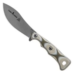 The newest member of the TOPS family is yet another Leo Espinoza designed model that began as his own personal hunting knife and transformed into a production knife. While the Viper Scout, White Fang and Tex Creek have all done the same, this model has been outfitted with a high performance CPM-S35VN blade for superior edge retention and stainless properties. Notice the larger belly on the blade? It’s blade shape versatility allows for the skinning of game or just your standard outdoor tasks. This model features 3-color camo-style G-10 handles, a skinning style blade in a tumbled stonewash finish and the coyote tan kydex sheath provides a brown leather dangler clip option. Made in the USA.