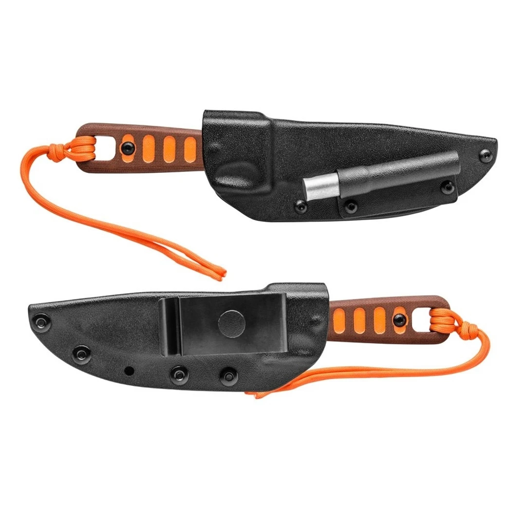 The TOPS Lite Trekker is the culmination of several months of designing and refining–but the end-result was completely worth the wait. Each full-tang designed model has several well thought out features such as a positive grip, high-visibility squares set into the handle design as well as a think blade that reduces the overall weight without sacrificing function performance. This model features tan linen micarta handles with hunter’s orange-colored inlays, a hunter’s point style blade in a black traction coating and the black kydex sheath boasts a rotating spring steel clip. Made in the USA.