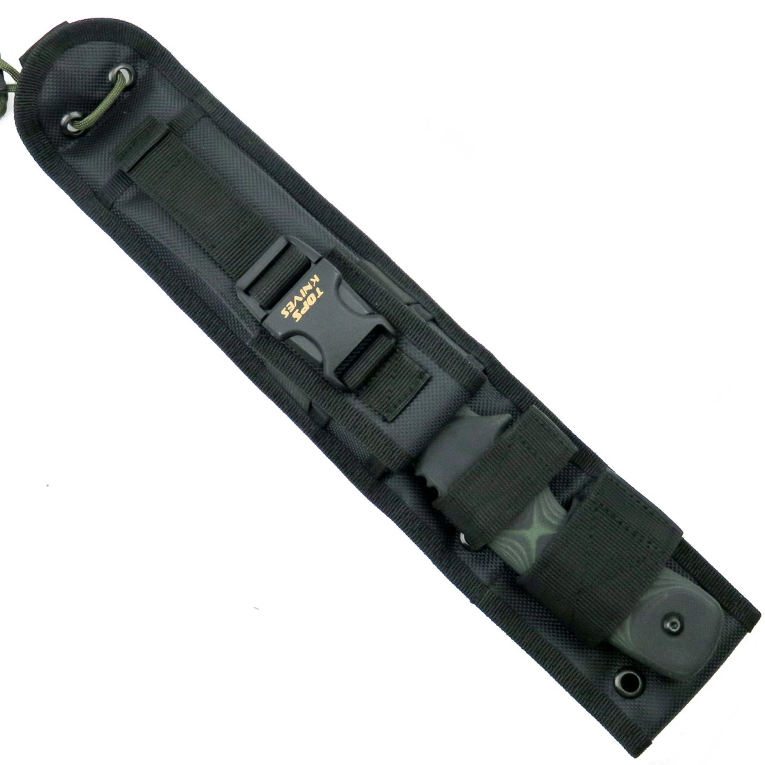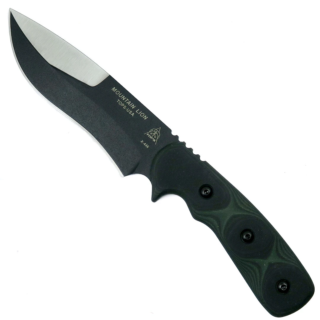 The Mountain Lion finally made its way onto the market after numerous conversations, design ideas and input from the several retired and active member of the famed 10th Mountain Light Infantry Division. Each full-tang designed model offers excellent ergonomics for all types of environments and the blade shape was purposely designed with a slight recurve for any and all needs. This model features black G-10 handles in a black and green finish, a modified drop point style blade in a black traction coating and the black ballistic nylon sheath includes MOLLE backing and provides a belt carry option. Made in the USA.