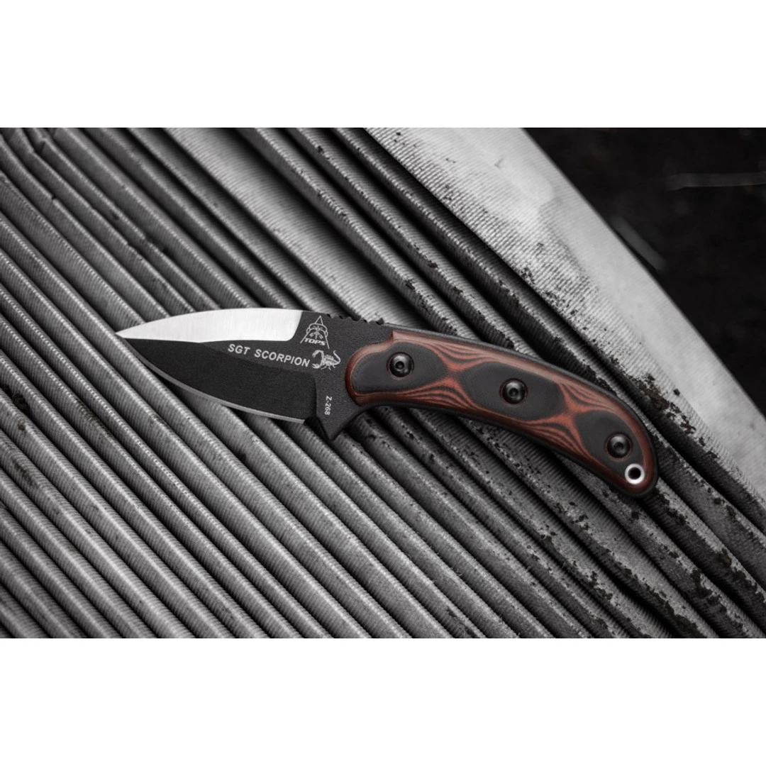 The TOPS SGT. Scorpion Knife is a fantastic knife, with a 1/4″ thick spear point blade. This knife is made ready for combat. Each blade, hand made in the USA, is the ultimate small tactical blade, with incredible penetration power. The handle is made to fit your hand. Includes a black Kydex sheath. Â