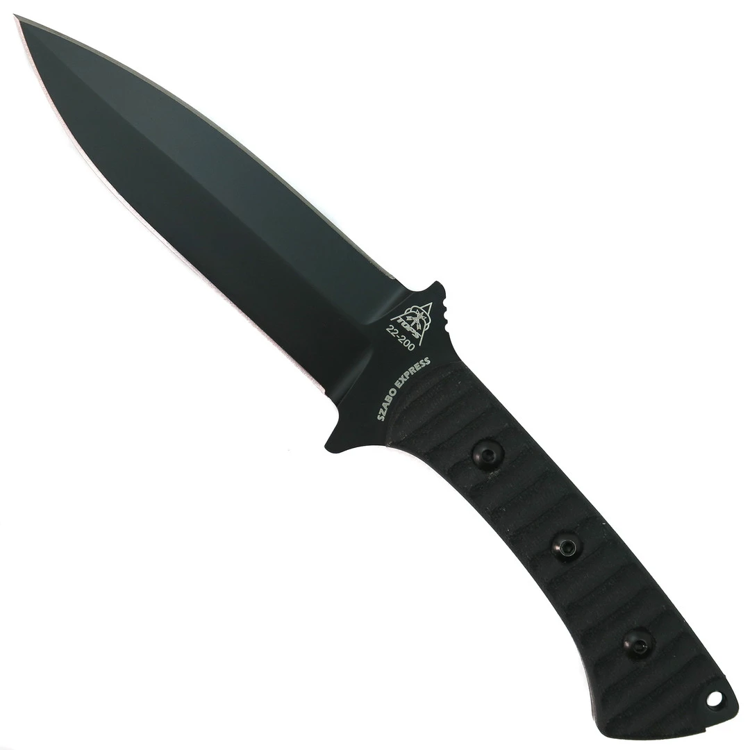 The TOPS Szabo Express Fixed Blade Knife, Double Edge Black Blade is the ideal knife for survival and self-defense situations. This knife clocks in at just over 10″ long overall and boasts a blade made of 1095, which is tough and can take a wicked sharp edge. This double-edged blade has a stealthy black cerakote finish. This tough blade is paired with a handle made of black canvas micarta which has an ergonomic design for a comfortable, solid grip however you choose to hold it. This knife is the perfect blend between a large folding knife and a small fixed blade. This fighting knife is the perfect everyday carry.Â
