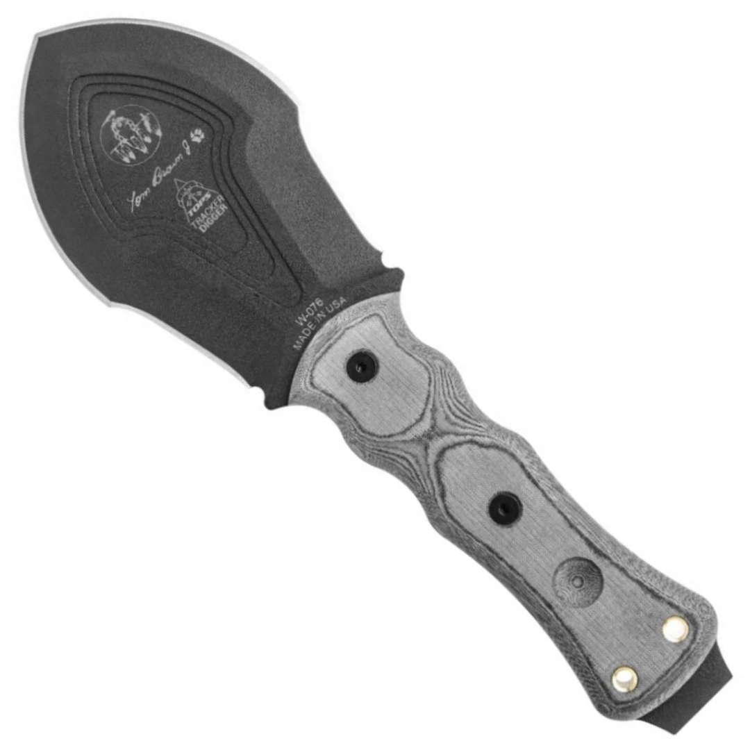 The unique nature of the Tracker Digger combines aesthetic elements from three knife styles–a smatchet, a hori hori and TOPS’ famous Tom Brown Tracker. With a sharpened edge on both sides, this fixed blade is perfect for harvesting wild edibles in the forest to digging roots out in the garden–tiptoeing the line between both shovel and knife. This model features black linen micarta handles, a modified dagger style blade in a black traction coating and the black ballistic nylon sheath includes MOLLE backing and provides a belt carry option. Made in the USA.