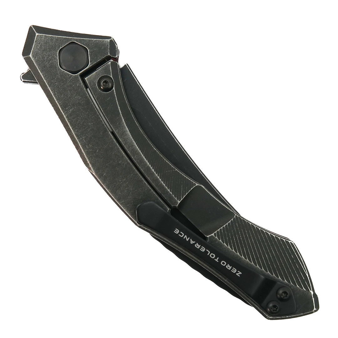 The ultra-premium stainless steel blade is deployed with an ambidextrous flipper tab and the KVT ball-bearing manual opening system allows for quick fluid action even without the use of any springs while the frame lock design is outfitted with a steel lockbar insert.